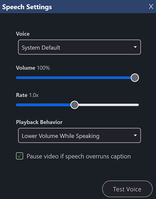 You can customize Kollaborate’s behavior when speaking captions, including automatically lowering the volume while the caption is spoken, or pausing playback completely. You can also set it to pause playback if the speech overruns the length of the caption and then resume again automatically.